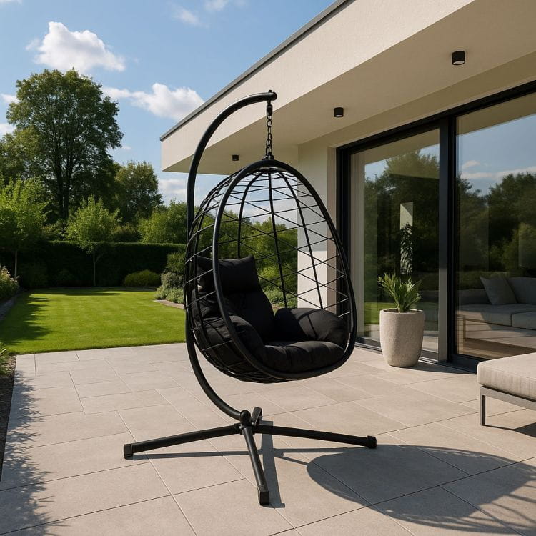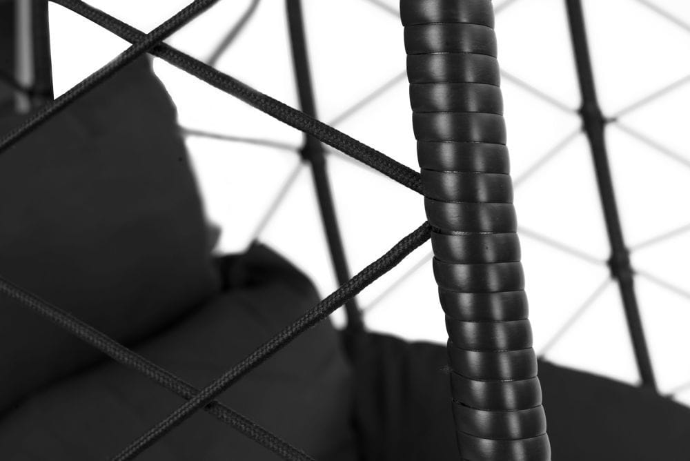 Przeznaczony do użytku wewnętrznego i zewnętrznego, jest odporny na warunki atmosferyczne i promieniowanie UV. System zawieszenia z łańcuchem i sprężyną zapewnia płynne, ciche bujanie oraz zwiększa trwałość konstrukcji. Antypoślizgowe stopki chronią podłoże i stabilizują fotel. Miękkie poduszki z poliestru 180 g/m² z rozpinanymi poszewkami dopasowane są do formy kokonu, a zagłówek posiada możliwość przymocowania do konstrukcji.